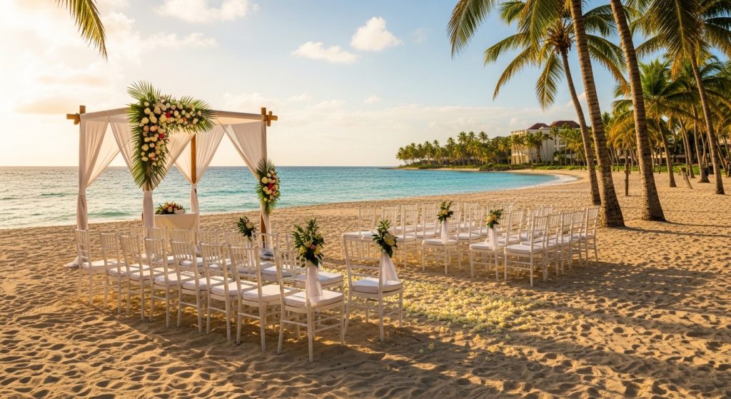 | Ceremonia en playa (resort) | $500 – $3,500 | ≈ 27,500 – 192,500 DOP | 20 – 200 personas |